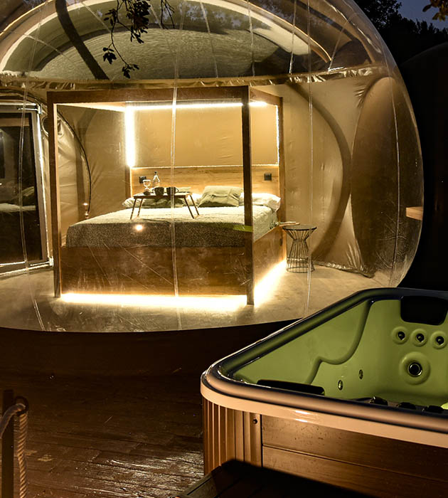 Imagina una noche mágica durmiendo bajo un manto de estrellas en plena naturaleza. Nuestra bubble room en Cortijo Colomo te ofrece esta experiencia única e inolvidable. Estarás rodeado de comodidades mientras te sumerges en la serenidad del entorno natural. Desde la privacidad de tu habitación de burbuja, podrás admirar el cielo nocturno y despertar con los rayos del sol acariciándote suavemente. Esta es tu oportunidad de vivir una escapada romántica o de disfrutar de un momento de tranquilidad contigo mismo.